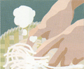 【1】 大き目の鍋にタップリ沸騰した湯の中に、をほぐし入れます。沸騰したお湯に“うどん”を入れる時は、優しくほぐしてから茹でて下さい。力を入れると“うどん”が崩れてしまうので、気をつけて!